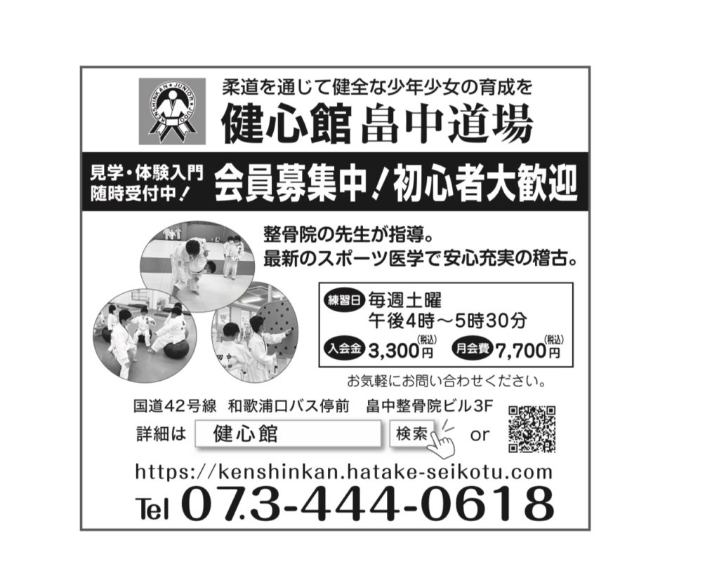 投稿日: 2022年5月5日 投稿者: 健心館畠中道場本日の毎日新聞広告朝刊に当館広告掲載されてます こんにちわ 和歌山市 和歌浦口バス停前 畠中整骨院ビル3階 柔道教室 健心館畠中道場館長 畠中健でございます 本日毎日新聞朝刊和歌山版にて、和歌祭特集記事にて当館の広告いれてます 一度ご覧ください センターあたりにあります よろしくお願い申し上げます。 #毎日新聞 #和歌山版 #毎日新聞広告 #和歌浦口バス停前 #柔道教室 #健心館畠中道場 #和歌祭 健心館 畠中道場は子供たちに柔道の指導を行う、和歌山市和歌浦西にある道場です。